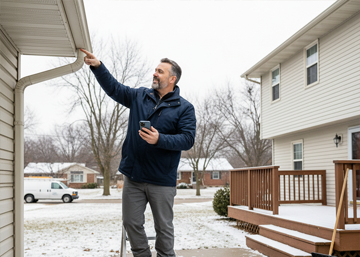 Create a short schedule that matches your weather. A quick exterior check after the first snow helps you spot trouble. Look for sagging gutters, icy patches where downspouts drain, and leaf piles that drifted back onto steps or a deck corner.